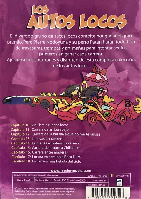 Serie de TV (1968-1969). 17 episodios (cada uno de los cuales incluÃa dos carreras distintas, haciendo un total de 34 carreras). «Los autos locos» es una serie de dibujos animados de la productora estadounidense Hanna-Barbera sobre un grupo de once coches de carrera que compiten entre sà en diferentes rallies, con sus pilotos intentando ganar el tÃtulo de «Piloto Más Loco del Mundo». La serie era inusual por el gran número de personajes habituales, veintitrés en total, entre los que se incluia el villano Pierre Nodoyuna y su perro, Patán.