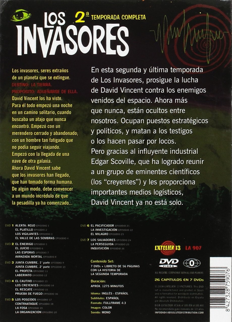 Serie de TV (1967-1968). 2 temporadas. 43 episodios. Los invasores, seres extraños de un planeta que se extingue. Destino: La Tierra. Propósito: Adueñarse de ella. David Vincent los ha visto. Para él todo empezó una noche en un camino solitario, cuando buscaba un atajo que nunca encontró. Empezó con un merendero cerrado y abandonado; con un hombre tan fatigado que no podÃa seguir viajando. Empezó con la llegada de una nave de otra galaxia. Ahora David Vincent sabe que los invasores han llegado, que han tomado forma humana. De algún modo, debe convencer a un mundo incrédulo de que la pesadilla ya ha comenzado.