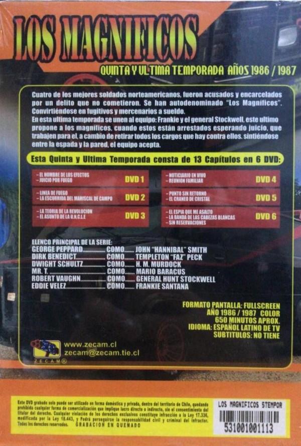 Cantidad de Discos: 6 | Lanzamiento: 2010 | Género(s): Serie de TV, Aventuras, Acción | Audio: Español, Inglés | SubtÃtulos: Español | TÃtulo: The A-Team (1983) | Director(es): Stephen J. Cannell (Creador), Frank Lupo (Creador), Michael O’Herlihy, Dennis Donnelly, Craig R. Baxley, David Hemmings, Tony Mordente, Arnold Laven, Christian I. Nyby II, Ron Satlof, Sidney Hayers, Gilbert M. Shilton, Bruce Kessler, Guy Magar, Bernard McEveety, Chuck Bowman, Rod Holcomb, Ivan Dixon, James Fargo, Michael Vejar, Nicholas Sgarro, Bob Bralver, James Darren, Les Sheldon, John Peter Kousakis | Reparto: George Peppard, Mr. T, Dwight Schultz, Dirk Benedict, Melinda Culea, Eddie Velez, Robert Vaughn, Jack Ging, Tim Dunigan, Lance LeGault, William Lucking, Marla Heasley, Red West, Carl Franklin, Jim Boeke, Tracy Scoggins, Dana Elcar, Betsy Russell, Bill Dyer, Marta DuBois, Tricia O’Neil, Kai Wulff, Della Reese, Hulk Hogan | Norma / Región: Multizona (Disco Quemado) | Cantidad de Discos: 6 | Lanzamiento: 2010 | Género(s
