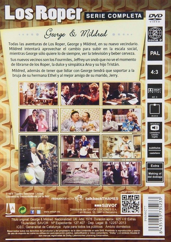 Cantidad de Discos: 5 | Lanzamiento: 2013 | Género(s): Serie de TV, Comedia | Audio: Español, Catalán, Inglés | SubtÃtulos: Español | TÃtulo: George and Mildred (1976) | Director(es): Peter Frazer-Jones | Reparto: Yootha Joyce, Brian Murphy, Norman Eshley, Sheila Fearn, Avril Elgar, Hal Dyer, Roy Kinnear, Nicholas Bond-Owen, Reginald Marsh, Simon Lloyd, Peter Birrel, Norman Mitchell, John Lyons, Gretchen Franklin, Paul Meier, Harry Littlewood, Robert Raglan, Jeremy Bulloch, Reg Lye, Tony Melody, Jean Marlow, Mike Lewin | Norma / Región: PAL (Región 2) | Cantidad de Discos: 5 | Lanzamiento: 2013 | Género(s): Serie de TV, Comedia | Audio: Español, Catalán, Inglés | SubtÃtulos: Español | TÃtulo: George and Mildred (1976) | Director(es): Peter Frazer-Jones | Reparto: Yootha Joyce, Brian Murphy, Norman Eshley, Sheila Fearn, Avril Elgar, Hal Dyer, Roy Kinnear, Nicholas Bond-Owen, Reginald Marsh, Simon Lloyd, Peter Birrel, Norman Mitchell, John Lyons, Gretchen Franklin,