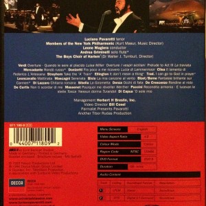 Pavarotti canta en vivo en Central Park, Nueva York con el Boys Choir Of Harlem, Andrea Giminelli y miembros de la New York Philarmonic Orchestra. Está dirigida por Leone Magiera y los tÃtulos cantados son: ‘O Sole Mio’, ‘La Girometta’, ‘Serenata’, ‘Chitarra Romana’ y ‘Recondita Armonia’.
