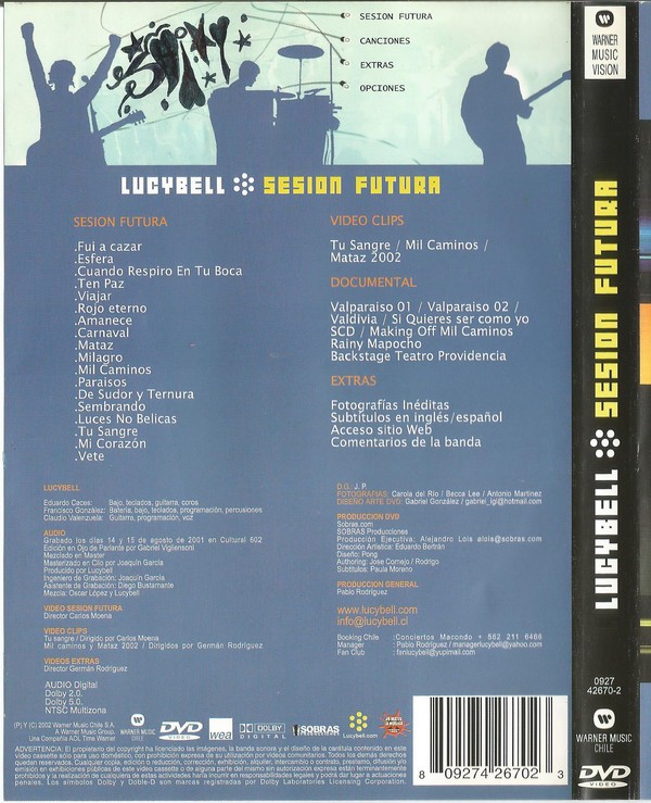 Artista(s) / Grupo: Lucybell | Cantidad de Discos: 1 | Lanzamiento: 2002 | Género(s): Rock | Estilo(s): Alternative Rock, Pop Rock | TÃtulo: Sesión Futura | Artista(s) / Grupo: Lucybell | Cantidad de Discos: 1 | Lanzamiento: 2002 | Género(s): Rock | Estilo(s): Alternative Rock, Pop Rock | TÃtulo: Sesión Futura