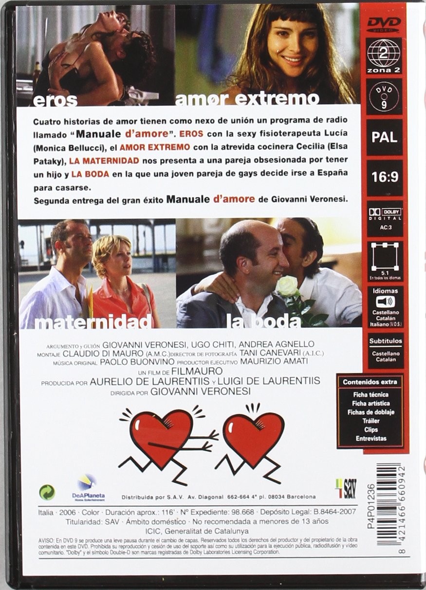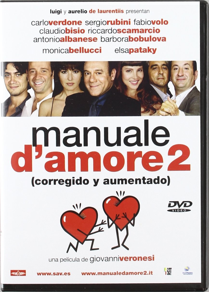 Cantidad de Discos: 1 | Lanzamiento: 2007 | Género(s): Comedia | Audio: Español | SubtÃtulos: Inglés | TÃtulo: Manuale D’ Amore 2 | Director(es): Giovanni Veronesi | Reparto: Carlo Verdone, Monica Bellucci, Riccardo Scamarcio, Fabio Volo, Sergio Rubini, Antonio Albanese, Claudio Bisio, Barbora Bobulova, Elsa Pataky, Dario Bandiera, Cosimo Cinieri, Lucia Vasini, Gea Lionello, Eugenia Costantini | Norma / Región: PAL (Región 2) | Cantidad de Discos: 1 | Lanzamiento: 2007 | Género(s): Comedia | Audio: Español | SubtÃtulos: Inglés | TÃtulo: Manuale D’ Amore 2 | Director(es): Giovanni Veronesi | Reparto: Carlo Verdone, Monica Bellucci, Riccardo Scamarcio, Fabio Volo, Sergio Rubini, Antonio Albanese, Claudio Bisio, Barbora Bobulova, Elsa Pataky, Dario Bandiera, Cosimo Cinieri, Lucia Vasini, Gea Lionello, Eugenia Costantini | Norma / Región: PAL (Región 2)