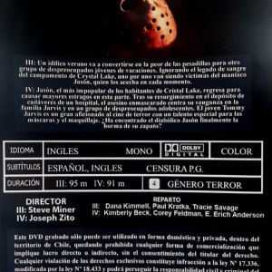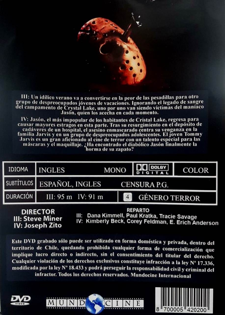 Cantidad de Discos: 2 | Lanzamiento: 2010 | Género(s): Terror | Audio: Inglés | SubtÃtulos: Español, Inglés | TÃtulo: Friday the 13th Part III (1982) / Friday the 13th. The Final Chapter (1984) | Director(es): Steve Miner / Joseph Zito | Reparto: Dana Kimmell, Paul Kratka, Tracie Savage, Jeffrey Rogers, Catherine Parks, Larry Zerner, David Katims, Rachel Howard, Richard Brooker //