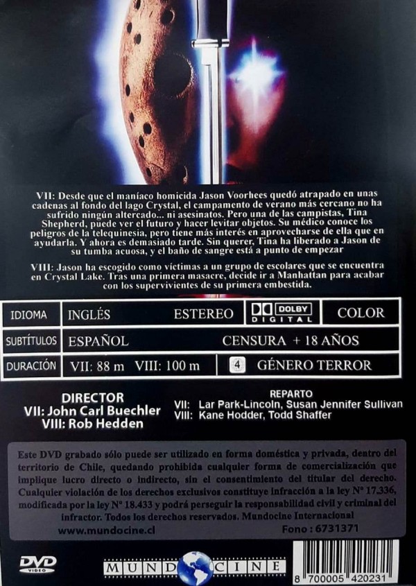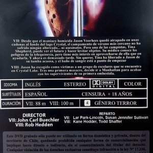 Cantidad de Discos: 1 | Lanzamiento: 2010 | Género(s): Terror | Audio: Inglés | SubtÃtulos: Español | TÃtulo: Friday the 13th, Part VII: The New Blood (1988) / Friday the 13th, Part VIII: Jason Takes Manhattan (1989) | Director(es): John Carl Buechler / Rob Hedden | Reparto: Lar Park-Lincoln, Susan Jennifer Sullivan, Kevin Spirtas, Terry Kiser, Susan Blu, Heidi Kozak, William Butler, Staci Greason, Diana Barrows, Larry Cox, Elizabeth Kaitan, Kane Hodder //