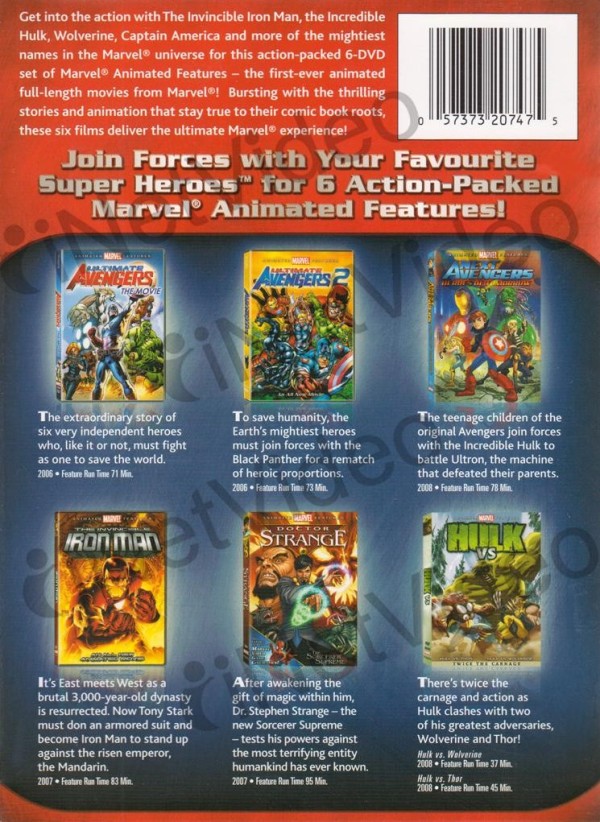 Cantidad de Discos: 6 | Lanzamiento: 2009 | Género(s): Animación. Acción. Ciencia ficción. Comedia. Aventura. Fantástico | Audio: Español (Dolby Digital 5,1), Inglés (Dolby Digital 5,1) | Subtítulos: Español, Inglés | Título: Vengadores definitivos – La película (2006) / Vengadores definitivos 2 – El ascenso de Pantera (2006) / Nuevos Vengadores: Héroes del mañana (2008) / El invencible Iron Man (2007) / Doctor Strange: El Hechicero Supremo (2007) / Hulk vs. Thor (2009) / Hulk vs. Wolverine (2008) | Director(es): Curt Geda, Steven E. Gordon, Bob Richardson / Will Meugniot, Dick Sebast, Bob Richardson / Jay Oliva / Jay Oliva, Frank Paur, Patrick Archibald / Jay Oliva, Frank Paur / Sam Liu / Frank Paur | Reparto: Animación | Norma / Región: NTSC 1 | Series: Marvel | Cantidad de Discos: 6 | Lanzamiento: 2009 | Género(s): Animación. Acción. Ciencia ficción. Comedia. Aventura. Fantástico | Audio: Español (Dolby Digital 5,1), Inglés (Dolby Digital 5,1) | Subtítulos: Español, Inglés | Tít