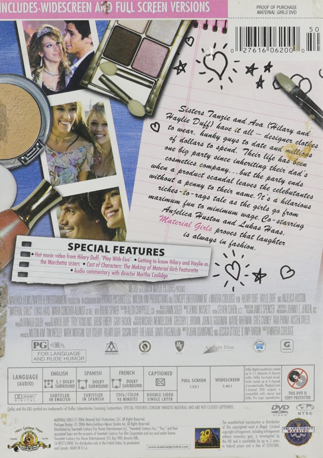 Cantidad de Discos: 1 | Lanzamiento: 2006 | Género(s): Comedia. | Audio: Español, Inglés, Francés | SubtÃtulos: Español, Inglés, Francés | TÃtulo: Material Girls | Director(es): Martha Coolidge. | Reparto: Hilary Duff, Haylie Duff, Anjelica Huston, Lukas Haas, Maria Conchita Alonso, Brent Spiner, Marcus Coloma, Ty Hodges, Christina R. Copeland, Obba Babatundé, Terri Seymour, Reagan Dale Neis, Natalie Lander, Judy Tenuta, Kayla Ewell. | Norma / Región: NTSC (Región A) | Cantidad de Discos: 1 | Lanzamiento: 2006 | Género(s): Comedia. | Audio: Español, Inglés, Francés | SubtÃtulos: Español, Inglés, Francés | TÃtulo: Material Girls | Director(es): Martha Coolidge. | Reparto: Hilary Duff, Haylie Duff, Anjelica Huston, Lukas Haas, Maria Conchita Alonso, Brent Spiner, Marcus Coloma, Ty Hodges, Christina R. Copeland, Obba Babatundé, Terri Seymour, Reagan Dale Neis, Natalie Lander, Judy Tenuta, Kayla Ewell. | Norma / Región: NTSC (Región A)