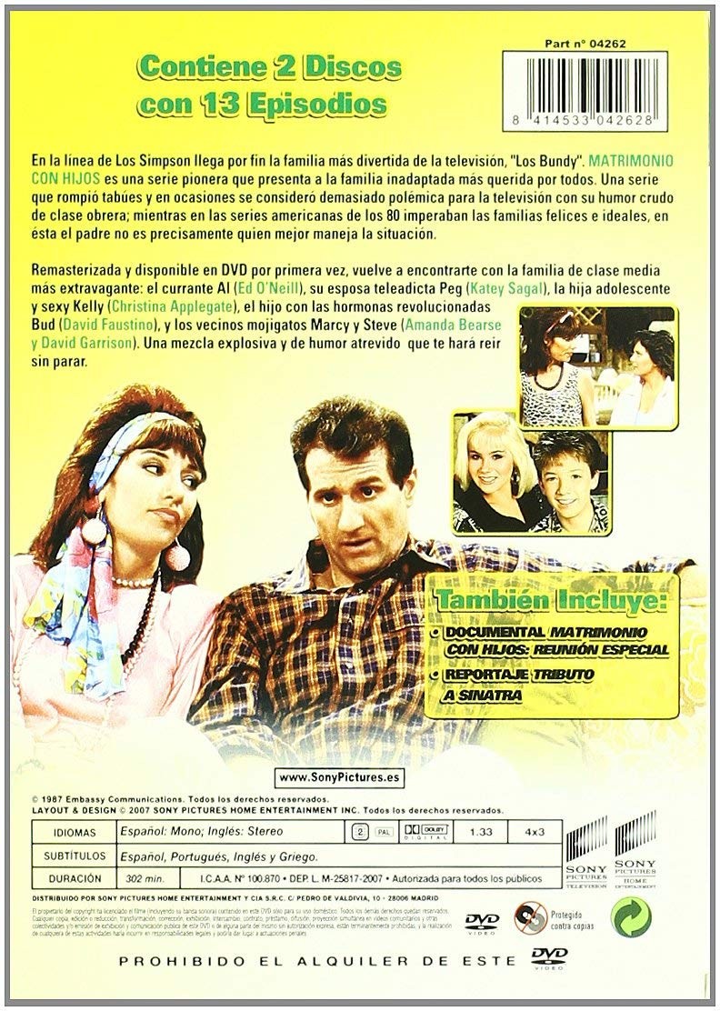 Cantidad de Discos: 2 | Lanzamiento: 2007 | Género(s): Serie de TV, Comedia | Audio: Español, Inglés | SubtÃtulos: Español, Inglés, Portugués | TÃtulo: Married with Children (1987) – Temporada 1 | Director(es): Ron Leavitt (Creator), Michael G. Moye (Creator), Gerry Cohen, Linda Day, Amanda Bearse, Sam W. Orender, Tony Singletary, Mark K. Samuels, Zane Buzby, Brian Levant, Arlando Smith, James Eric Hornbeck, John Sgueglia, Katherine Green, Rich Correll | Reparto: Ed O’Neill, Katey Sagal, Amanda Bearse, David Faustino, Christina Applegate, Buck, Ted McGinley, David Garrison, Kevin Curran, Harold Sylvester, E.E. Bell, Dan Tullis Jr., Tom McCleister, Gita Isak, Frank Lloyd, Edd Hall, Shane Sweet, Teresa Parente, Bert L. Cook, Janet Carroll, Steve Susskind, Ritch Shydner, Hill Harper, Kathleen Freeman | Norma / Región: PAL (Región 2) | Cantidad de Discos: 2 | Lanzamiento: 2007 | Género(s): Serie de TV, Comedia | Audio: Español, Inglés | SubtÃtulos: Español, Inglés, P