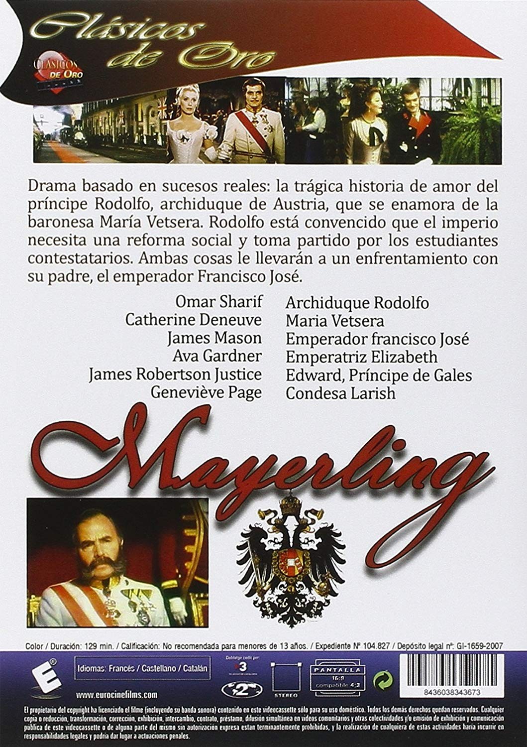 Cantidad de Discos: 1 | Lanzamiento: 2015 | Género(s): Drama, Romance | Audio: Español, Francés, Catalán | TÃtulo: Mayerling (1968) | Director(es): Terence Young | Reparto: Omar Sharif, Catherine Deneuve, James Mason, Ava Gardner, James Robertson Justice, Geneviève Page, Andréa Parisy, Ivan Desny, Mony Dalmès, Howard Vernon | Norma / Región: PAL (Región 2) | Cantidad de Discos: 1 | Lanzamiento: 2015 | Género(s): Drama, Romance | Audio: Español, Francés, Catalán | TÃtulo: Mayerling (1968) | Director(es): Terence Young | Reparto: Omar Sharif, Catherine Deneuve, James Mason, Ava Gardner, James Robertson Justice, Geneviève Page, Andréa Parisy, Ivan Desny, Mony Dalmès, Howard Vernon | Norma / Región: PAL (Región 2)
