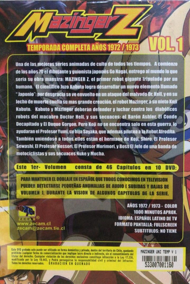 Cantidad de Discos: 10 | Lanzamiento: 2010 | Género(s): Serie de TV, Animación, Fantástico, Ciencia ficción, Aventuras, Acción, Infantil | Audio: Español | TÃtulo: Majingâ Zetto (1972) | Director(es): Tomoharu Katsumata, Bonjin Nagaki, Katsuhisa Yamada, Kouichi Sasaki, Masamune Ochiai, Masayuki Akehi, Nobuo Onuki, Nobutaka Nishizawa, Takashi Kuoka, Takeshi Tamiya, Tokushige Shirane, Tsunekiyo Otani, Yasuo Yamayoshi, Yoshikatsu Kasai, Yugo Serikawa | Reparto: Animación | Norma / Región: Multizona (Disco quemado) | Cantidad de Discos: 10 | Lanzamiento: 2010 | Género(s): Serie de TV, Animación, Fantástico, Ciencia ficción, Aventuras, Acción, Infantil | Audio: Español | TÃtulo: Majingâ Zetto (1972) | Director(es): Tomoharu Katsumata, Bonjin Nagaki, Katsuhisa Yamada, Kouichi Sasaki, Masamune Ochiai, Masayuki Akehi, Nobuo Onuki, Nobutaka Nishizawa, Takashi Kuoka, Takeshi Tamiya, Tokushige Shirane, Tsunekiyo Otani, Yasuo Yamayoshi, Yoshikatsu Kasai, Yugo Serikawa | Reparto: Animación | Norma / Reg