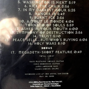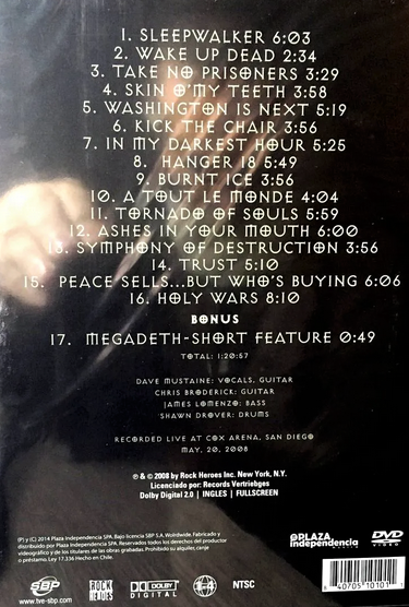 Artista(s) / Grupo: Megadeth | Cantidad de Discos: 1 | Lanzamiento: 2008 | Género(s): Rock | Estilo(s): Heavy metal, thrash metal, speed metal | Norma / Región: NTSC (Región 1, 4) | Tipo Equipo: In USA 2008 | Artista(s) / Grupo: Megadeth | Cantidad de Discos: 1 | Lanzamiento: 2008 | Género(s): Rock | Estilo(s): Heavy metal, thrash metal, speed metal | Norma / Región: NTSC (Región 1, 4) | Tipo Equipo: In USA 2008