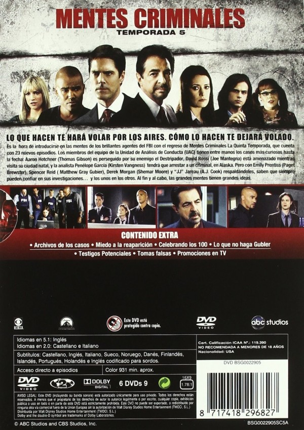Cantidad de Discos: 6 | Lanzamiento: 2005 | Género(s): Serie de TV. Intriga. Drama. | Audio: Castellano, Inglés, Italiano | SubtÃtulos: Castellano, Inglés, Italiano | TÃtulo: Criminal Minds – Season 5 | Director(es): Jeff Davis, Glenn Kershaw, Félix EnrÃquez Alcalá, Edward Allen Bernero, John Gallagher, Guy Norman Bee, Charles S. Carroll, Rob Spera, Charles Haid. | Reparto: Mandy Patinkin, Shemar Moore, Matthew Gray Gubler, Thomas Gibson, Jon Barton, Kirsten Vangsness, A.J. Cook, Joe Mantegna, Paget Brewster, Jeanne Tripplehorn, Lola Glaudini, Jennifer Love Hewitt, Jayne Atkinson, Adam Rodriguez, Aisha Tyler, Cade Owens, Brian Appel, Meredith Monroe, Nicholas Brendon, Meta Golding, Damon Gupton, Rachel Nichols, Jeananne Goossen, Tricia Helfer, Elle Fanning, Marisol Nichols, Josh Stewart, Bellamy Young, Michelle Pierce, Katheryn Winnick. | Norma / Región: PAL (Región 2) | Cantidad de Discos: 6 | Lanzamiento: 2005 | Género(s): Serie de TV. Intriga. Drama. | Audio: Castellano, Inglés, Italiano | Subt