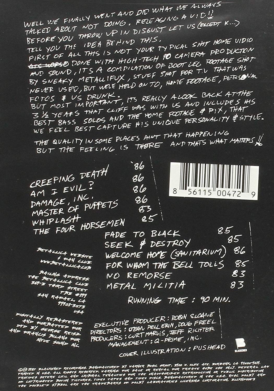 Artista(s) / Grupo: Metallica | Cantidad de Discos: 1 | Lanzamiento: 2014 | Género(s): Rock | Estilo(s): Thrash, Speed Metal, Heavy Metal | Audio: Inglés | TÃtulo: Cliff ‘Em All! | Director(es): Rhino Blackened | Sub-CategorÃas: Rock | Norma / Región: NTSC (Región 1, 4) | Artista(s) / Grupo: Metallica | Cantidad de Discos: 1 | Lanzamiento: 2014 | Género(s): Rock | Estilo(s): Thrash, Speed Metal, Heavy Metal | Audio: Inglés | TÃtulo: Cliff ‘Em All! | Director(es): Rhino Blackened | Sub-CategorÃas: Rock | Norma / Región: NTSC (Región 1, 4)
