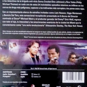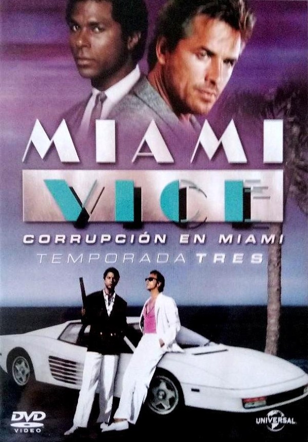 Serie de TV (1984-1990). 5 temporadas. 111 episodios. Ambientada en los años 80. James “Sonny” Crockett (Don Jonson) y Ricardo Tubbs (Philip Michael Thomas), una pareja de detectives infiltrados en el mundo del narcotráfico de Miami, llevan un tipo de vida acorde con su trabajo (Sonny vive en un velero junto con su mascota, un cocodrilo llamado “Elvis”, y Tubbs no se separa de su escopeta de cañones recortados). Ambos buscan a los asesinos del hermano de Tubbs.