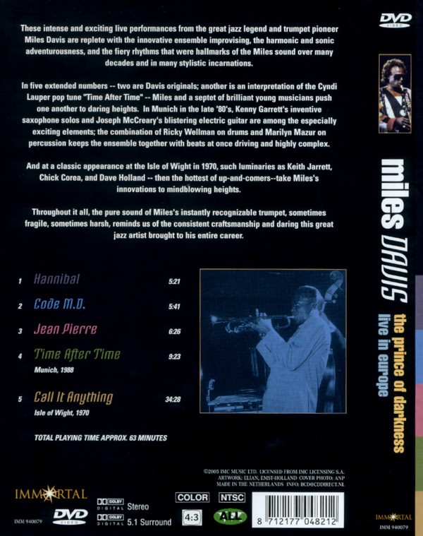 Artista(s) / Grupo: Miles Davis | Cantidad de Discos: 1 | Lanzamiento: 2005 | Género(s): Jazz | Audio: Inglés | Título: The Prince of darkness – Live In Europa | Norma / Región: NTSC (Región 1, 4) | Artista(s) / Grupo: Miles Davis | Cantidad de Discos: 1 | Lanzamiento: 2005 | Género(s): Jazz | Audio: Inglés | Título: The Prince of darkness – Live In Europa | Norma / Región: NTSC (Región 1, 4)