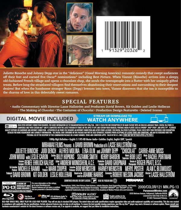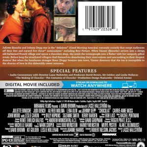 Reparto: Juliette Binoche, Judi Dench, Alfred Molina, Lena Olin, Johnny Depp, Carrie-Anne Moss, Victoire Thivisol, Peter Stormare, Leslie Caron, Antonio Gil, Harrison Pratt, Ron Cook, Gaelan Connell, Hugh O’Conor, Hélène Cardona, Christianne Oliveira, Aurelien Parent Koenig, Elisabeth Commelin, Guillaume Tardieu, John Wood, Michèle Gleizer, Dominique MacAvoy, Arnaud Adam, Marion Hauducoeur, Esteban Antonio, J.J. Holiday, Malcolm Ross, Ged Barry, Iain Stoddart, Sally Taylor-Isherwood, Tatyana Yassukovich, João Costa Menezes