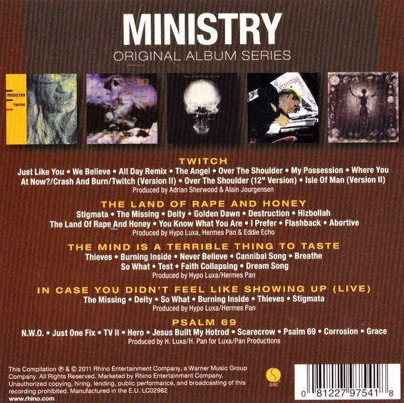 Artista(s) / Grupo: Ministry | Cantidad de Discos: 5 CD | Lanzamiento: 2011 | Género(s): Electronic, Rock | Estilo(s): Rock Industrial, Electro Industrial, New Wave, Trash Metal | TÃtulo: Original Album Series | Artista(s) / Grupo: Ministry | Cantidad de Discos: 5 CD | Lanzamiento: 2011 | Género(s): Electronic, Rock | Estilo(s): Rock Industrial, Electro Industrial, New Wave, Trash Metal | TÃtulo: Original Album Series