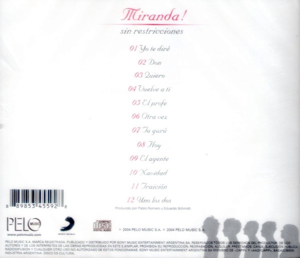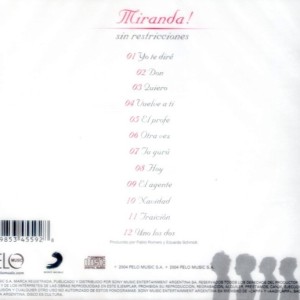 Artista(s) / Grupo: Miranda! | Cantidad de Discos: 1 | Lanzamiento: 2016 | Género(s): Electronic, Pop | Estilo(s): Synth-pop | TÃtulo: Sin Restricciones | Artista(s) / Grupo: Miranda! | Cantidad de Discos: 1 | Lanzamiento: 2016 | Género(s): Electronic, Pop | Estilo(s): Synth-pop | TÃtulo: Sin Restricciones