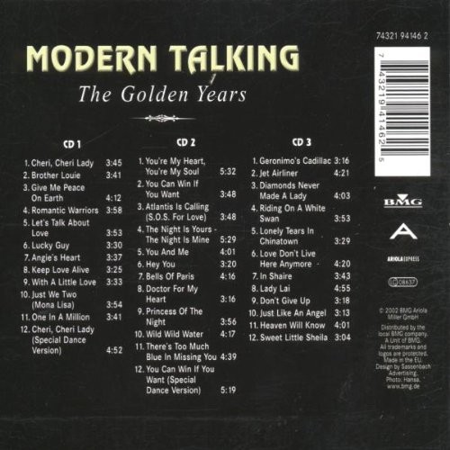 Artista(s) / Grupo: Modern Talking | Cantidad de Discos: 3 | Lanzamiento: 2002 | Estilo(s): Pop | TÃtulo: Golden years | Artista(s) / Grupo: Modern Talking | Cantidad de Discos: 3 | Lanzamiento: 2002 | Estilo(s): Pop | TÃtulo: Golden years | Artista(s) / Grupo: Modern Talking | Cantidad de Discos: 3 | Lanzamiento: 2002 | Estilo(s): Pop | TÃtulo: Golden years