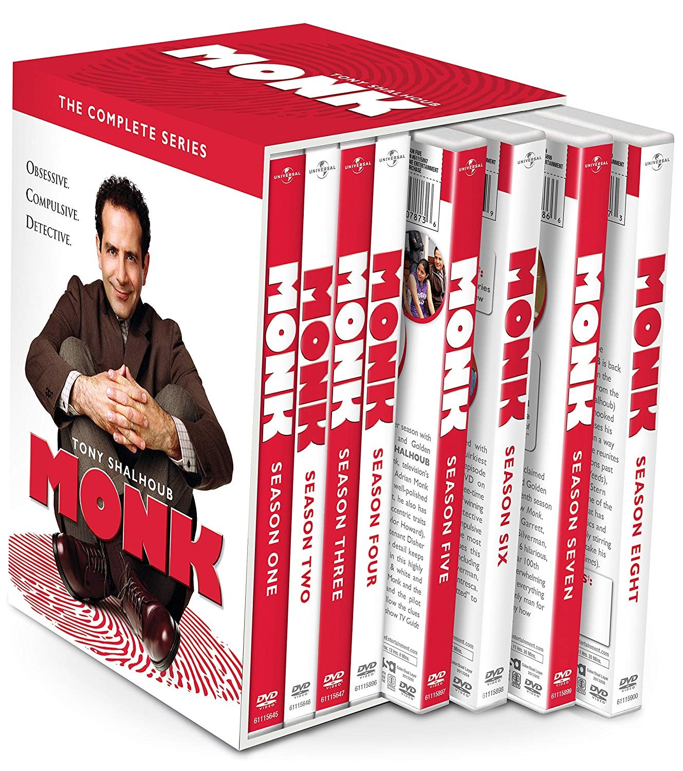 Cantidad de Discos: 8 | Lanzamiento: 2002 | Género(s): Serie de TV. Comedia. Drama. Intriga | Audio: Inglés (Dolby Digital 5,1), Español (Dolby Digital Stereo, Dolby Digital 5,1), Francés (Dolby Digital Stereo, Dolby Digital 5,1) | SubtÃtulos: Español, Inglés, Francés | TÃtulo: Monk – La serie completa | Director(es): Andy Breckman (Creator), Randall Zisk, Jerry Levine, Andre Belgrader, Michael Zinberg, Anton Cropper, Michael W. Watkins, Dean Parisot, Anthony R. Palmieri, David Breckman, Eric Laneuville, Kevin Inch, Rob Thompson, Ron Underwood, Philip Casnoff, David Grossman, Stephen Surjik, Paris Barclay, Wendey Stanzler, Tawnia McKiernan, Daniel Dratch | Reparto: Tony Shalhoub, Ted Levine, Traylor Howard, Jason Gray-Stanford, Bitty Schram, Stanley Kamel, Hector Elizondo, Emmy Clarke, Melora Hardin, Kane Ritchotte, Brooke Adams, Tim Bagley, John Turturro, Virginia Madsen, Sarah Silverman, Casper Van Dien, Max Morrow, Jarrad Paul, Glenne Headly, Stellina Rusich | Norma / Región: NTSC 1 | Cantidad de
