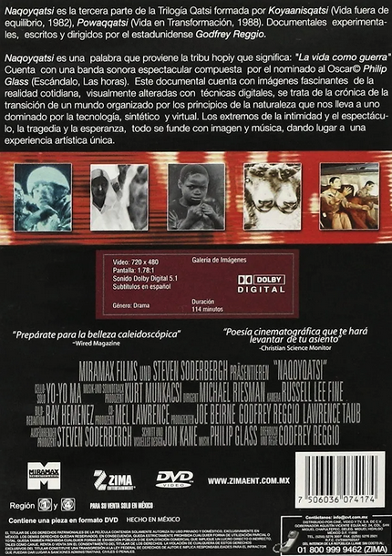 Cantidad de Discos: 1 | Lanzamiento: 2002 | Género(s): Documental, Drama | Audio: Inglés (Dolby Digital 5,1) | SubtÃtulos: Español | TÃtulo: Naqoyqatsi – Life as a War | Director(es): Godfrey Reggio | Norma / Región: NTSC (Región 1, 4) | Cantidad de Discos: 1 | Lanzamiento: 2002 | Género(s): Documental, Drama | Audio: Inglés (Dolby Digital 5,1) | SubtÃtulos: Español | TÃtulo: Naqoyqatsi – Life as a War | Director(es): Godfrey Reggio | Norma / Región: NTSC (Región 1, 4)