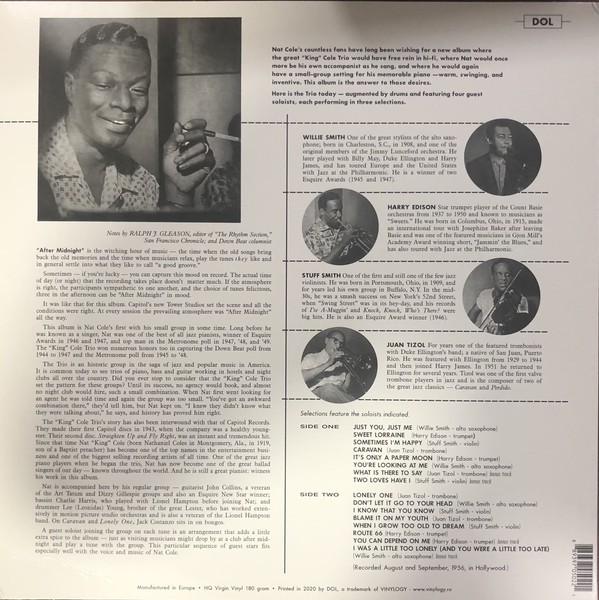 Artista(s) / Grupo: Nat ‘King’ Cole And His Trio | Cantidad de Discos: 1 LP | Lanzamiento: 2020 | Género(s): Jazz | Estilo(s): Swing | Título: After Midnight | Artista(s) / Grupo: Nat ‘King’ Cole And His Trio | Cantidad de Discos: 1 LP | Lanzamiento: 2020 | Género(s): Jazz | Estilo(s): Swing | Título: After Midnight