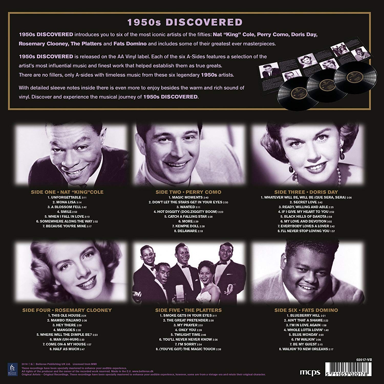 Artista(s) / Grupo: Nat King Cole, Perry como, Doris Day, Rosemary Clooney, The Platters, Fats Domino | Cantidad de Discos: 3 LP | Género(s): Jazz, Blues, Rock, Pop | TÃtulo: 1950s Discovered | Artista(s) / Grupo: Nat King Cole, Perry como, Doris Day, Rosemary Clooney, The Platters, Fats Domino | Cantidad de Discos: 3 LP | Género(s): Jazz, Blues, Rock, Pop | TÃtulo: 1950s Discovered