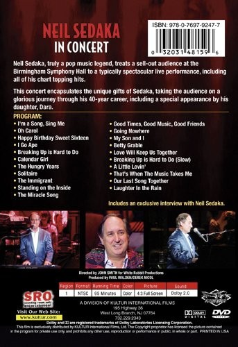 Neil Sedaka, verdaderamente una leyenda de la música pop, invita a una audiencia agotada en el Birmingham Symphony Hall a una actuación en vivo tÃpicamente espectacular, que incluye todos sus éxitos en las listas de éxitos. Este concierto resume los dones únicos de Sedaka, llevando a la audiencia a un viaje glorioso a través de su carrera de 40 años, incluida una aparición especial de su hija, Dara.