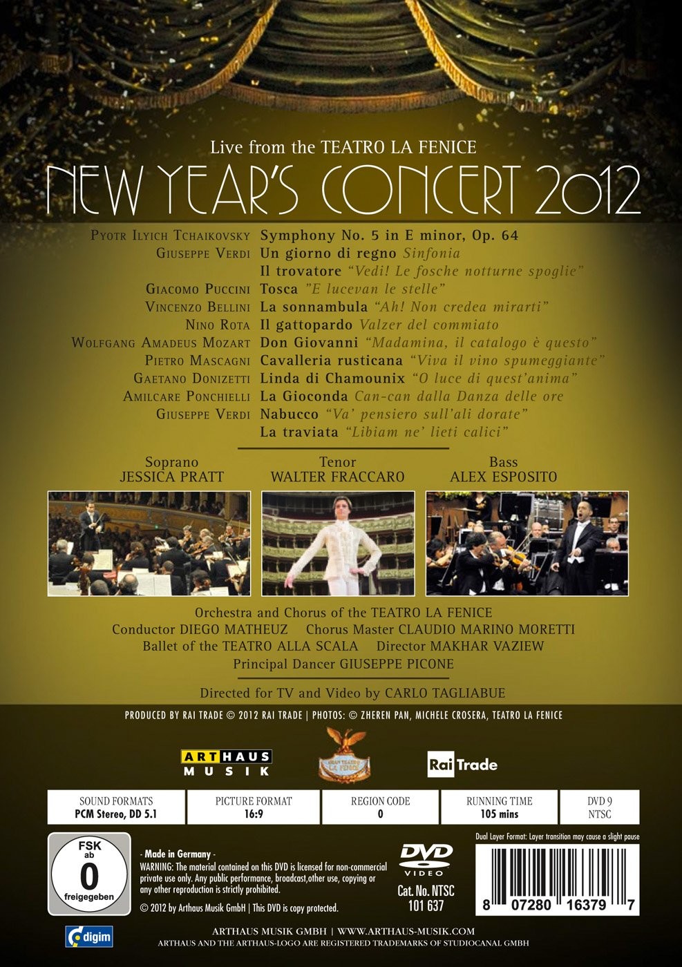 Diego Matheuz dirige la Orquesta y Coro del Teatro la Fenice para la presentación de este Año Nuevo, grabada en 2012. El programa presenta una interpretación de la SinfonÃa No. 5 de Tchaikovsky, junto con arias operÃsticas interpretadas por Jessica Pratt, Walter Fraccaro y Alex Esposito.