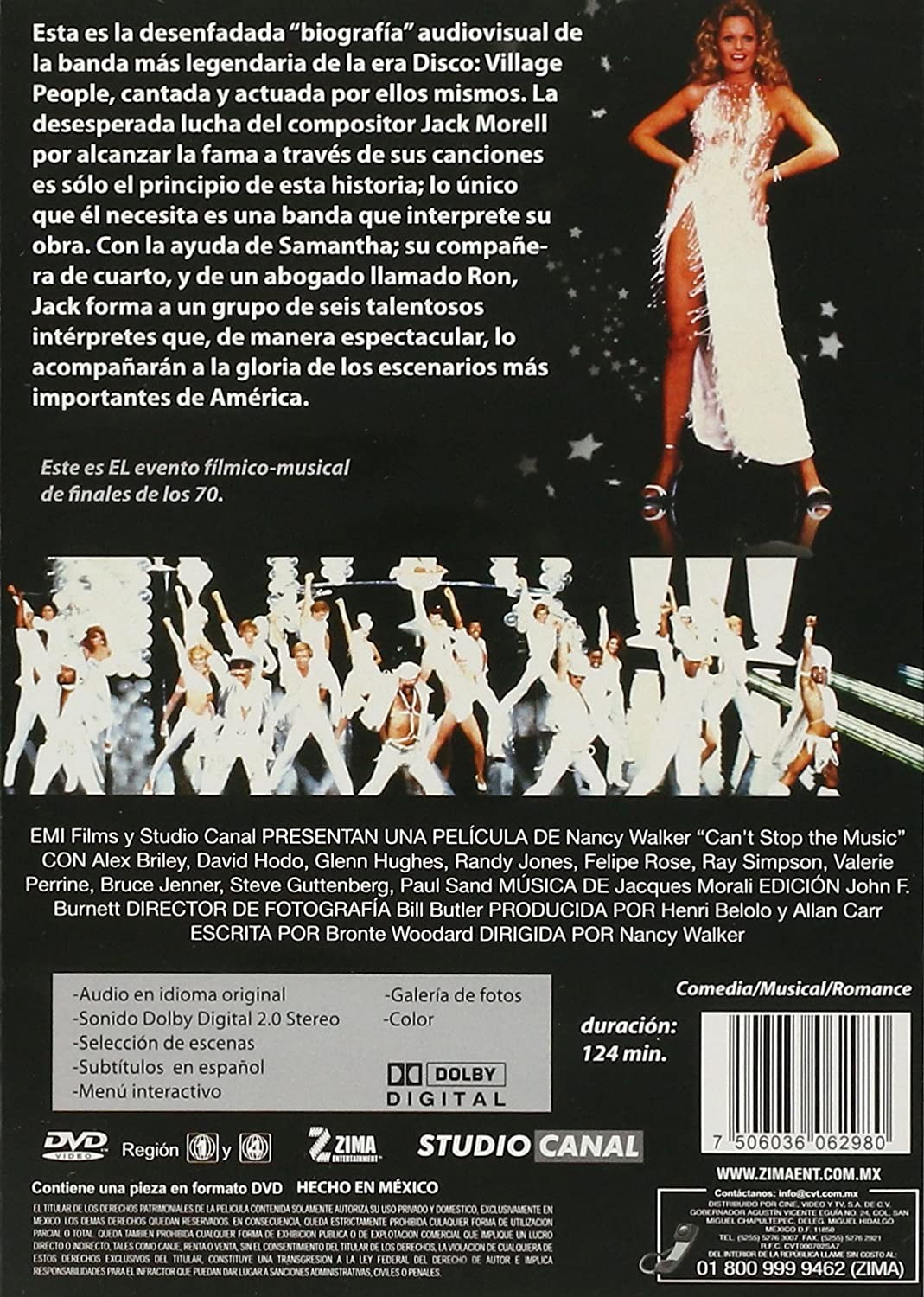 | Norma / Región: NTSC 1, 4 | Cantidad de Discos: 1 DVD | Lanzamiento: 1980 | Género(s): Musical, Comedia, Romance | Audio: Inglés | Subtítulos: Español | Título: Can’t stop the music | Director(es): Nancy Walker | Reparto: Steve Guttenberg, Valerie Perrine, Caitlyn Jenner, Alex Briley, Randy Jones, Glenn Hughes, David Hodo, Paul Sand, Ray Simpson, The Village People