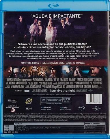 Cantidad de Discos: 1 | Lanzamiento: 2013 | Género(s): Terror | Audio: Español (Dolby Digital 5,1), Inglés (Dolby Digital 5,1) | SubtÃtulos: Español, Inglés, Portugués | TÃtulo: The Purge | Director(es): James DeMonaco | Reparto: Ethan Hawke, Lena Headey, Max Burkholder, Adelaide Kane, Rhys Wakefield, Edwin Hodge, Tony Oller, Tom Yi, Tyler Jaye, Alicia Vela-Bailey, John Weselcouch | Norma / Región: Multizona | Cantidad de Discos: 1 | Lanzamiento: 2013 | Género(s): Terror | Audio: Español (Dolby Digital 5,1), Inglés (Dolby Digital 5,1) | SubtÃtulos: Español, Inglés, Portugués | TÃtulo: The Purge | Director(es): James DeMonaco | Reparto: Ethan Hawke, Lena Headey, Max Burkholder, Adelaide Kane, Rhys Wakefield, Edwin Hodge, Tony Oller, Tom Yi, Tyler Jaye, Alicia Vela-Bailey, John Weselcouch | Norma / Región: Multizona