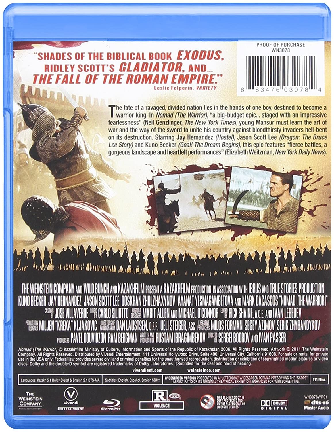 Cantidad de Discos: 1 | Lanzamiento: 2005 | Género(s): Bélico, Drama | Audio: Inglés, Francés, Español | SubtÃtulos: Español, Inglés, Francés | TÃtulo: Nomad: The Warrior | Director(es): Sergey Bodrov, Ivan Passer | Reparto: Kuno Becker, Jay Hernandez, Jason Scott Lee, Ashir Chokubayev, Ayanat Ksenbai, Doskhan Zholzhaksynov, Almaikhan Kenzhebekova, Mark Dacascos, Tungyshbai Dzhamankulov, Dilnaz Akhmadieva, Zhanas Iskakov, Erik Zholzhaksynov | Norma / Región: NTSC (Región A) | Cantidad de Discos: 1 | Lanzamiento: 2005 | Género(s): Bélico, Drama | Audio: Inglés, Francés, Español | SubtÃtulos: Español, Inglés, Francés | TÃtulo: Nomad: The Warrior | Director(es): Sergey Bodrov, Ivan Passer | Reparto: Kuno Becker, Jay Hernandez, Jason Scott Lee, Ashir Chokubayev, Ayanat Ksenbai, Doskhan Zholzhaksynov, Almaikhan Kenzhebekova, Mark Dacascos, Tungyshbai Dzhamankulov, Dilnaz Akhmadieva, Zhanas Iskakov, Erik Zholzhaksynov | Norma / Región: NTSC (Región A)