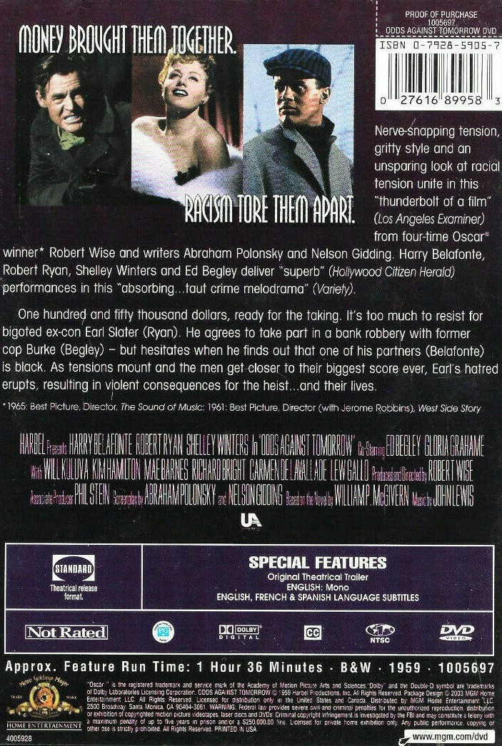 | Norma / Región: NTSC 1 | Cantidad de Discos: 1 DVD | Lanzamiento: 1959 | Género(s): Cine Negro, Drama, Crimen | Audio: Inglés | Subtítulos: Inglés, Francés, Español | Título: Odds Against Tomorrow | Director(es): Robert Wise | Reparto: Harry Belafonte, Robert Ryan, Shelley Winters, Ed Begley, Gloria Grahame, Will Kuluva, Kim Hamilton, Mae Barnes, Richard Bright, Carmen De Lavallade, Lew Gallo, Lois Thorne