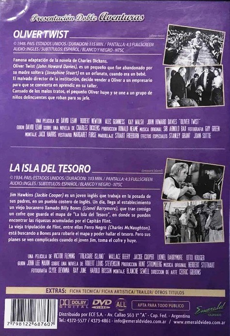 Jackie Cooper, Wallace Beery, Lewis Stone, Lionel Barrymore, Otto Kruger, Nigel Bruce, Charles McNaughton, Douglass Dumbrille, Charles Sale, Dorothy Peterson | Sub-Categorías: Literario | Norma / Región: Multizona | Cantidad de Discos: 1 | Lanzamiento: 2010 | Género(s): Drama, Aventuras, Histórico | Audio: Inglés | Subtítulos: Español | Título: Oliver Twist (1948) / Treasure Island (1934) | Director(es): David Lean / Victor Fleming | Reparto: Alec Guinness, Robert Newton, Francis L. Sullivan, John Howard Davies, Kay Walsh, Anthony Newley, Henry Stephenson/