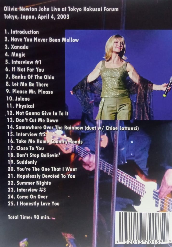 Artista(s) / Grupo: Olivia Newton John | Cantidad de Discos: 1 | Lanzamiento: 2003 | Género(s): Pop Rock | Audio: Inglés | TÃtulo: Tour Japan 2003 | Norma / Región: Multimedia (Disco Quemado) | Artista(s) / Grupo: Olivia Newton John | Cantidad de Discos: 1 | Lanzamiento: 2003 | Género(s): Pop Rock | Audio: Inglés | TÃtulo: Tour Japan 2003 | Norma / Región: Multimedia (Disco Quemado)