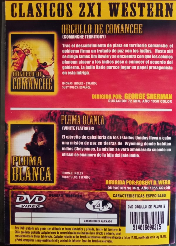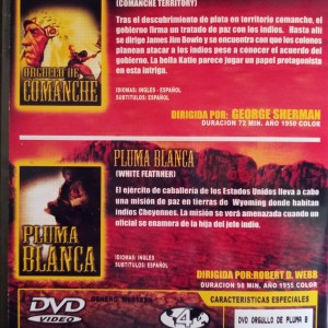 Cantidad de Discos: 2 DVD | Lanzamiento: 2010 | Género(s): Western | Audio: Español, Inglés | SubtÃtulos: Español | TÃtulo: Comanche Territory (1950) / White Feather (1955)