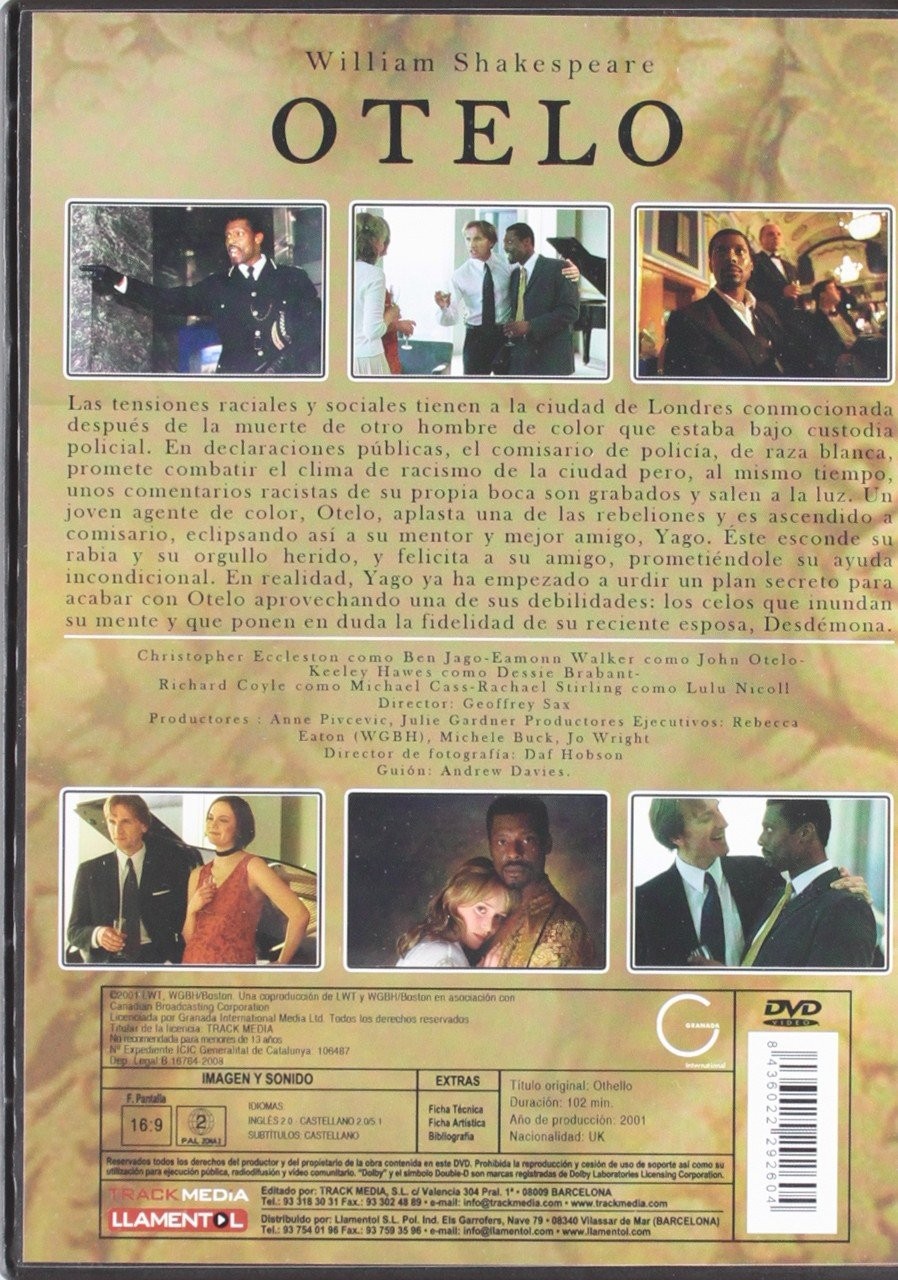 Cantidad de Discos: 1 | Lanzamiento: 2001 | Género(s): Drama | Audio: Inglés, Español | SubtÃtulos: Español | TÃtulo: Otelo | Director(es): Geoffrey Sax | Reparto: Keeley Hawes, Eamonn Walker, Christopher Eccleston, Christopher Fox, Allan Cutts, Patrick Myers, Samantha McDonald, Del Synnott, Andrew Charleson, Bill Paterson | Norma / Región: PAL (Región 2) | Cantidad de Discos: 1 | Lanzamiento: 2001 | Género(s): Drama | Audio: Inglés, Español | SubtÃtulos: Español | TÃtulo: Otelo | Director(es): Geoffrey Sax | Reparto: Keeley Hawes, Eamonn Walker, Christopher Eccleston, Christopher Fox, Allan Cutts, Patrick Myers, Samantha McDonald, Del Synnott, Andrew Charleson, Bill Paterson | Norma / Región: PAL (Región 2)