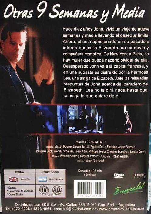 Cantidad de Discos: 1 | Lanzamiento: 1997 | Género(s): Drama | Audio: Inglés | SubtÃtulos: Español | TÃtulo: Otras 9 semanas y media | Director(es): Anne Goursaud | Reparto: Mickey Rourke, Angie Everhart, Agathe de La Fontaine, Steven Berkoff, Dougray Scott, Werner Schreyer, Faisal Attia, Andrea Eckert