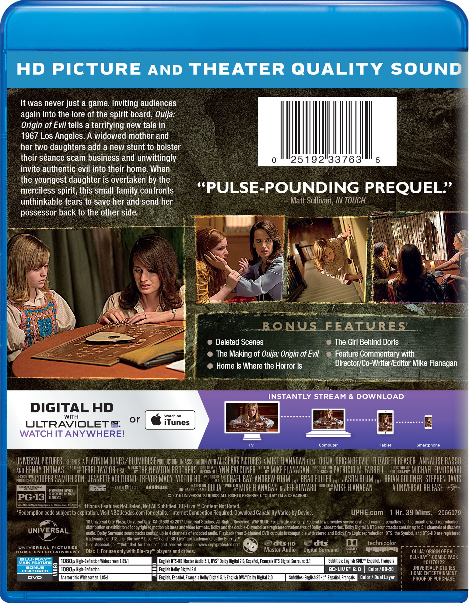 Cantidad de Discos: 1 + 1 DVD | Lanzamiento: 2017 | Género(s): Terror. | Audio: Inglés (Dolby Digital 2.0 Stereo), Inglés (Dolby Digital 5.1), Inglés (DTS-HD Master Audio 5.1), Francés (Dolby Digital 5.1), Francés (DTS 5.1), Español (Dolby Digital 5.1), Español (DTS 5.1) | Subtítulos: Francés, Español | Título: Ouija | Director(es): Mike Flanagan. | Reparto: Henry Thomas, Elizabeth Reaser, Doug Jones, Parker Mack, Sam Anderson | Norma / Región: NTSC (Región A) | Cantidad de Discos: 1 + 1 DVD | Lanzamiento: 2017 | Género(s): Terror. | Audio: Inglés (Dolby Digital 2.0 Stereo), Inglés (Dolby Digital 5.1), Inglés (DTS-HD Master Audio 5.1), Francés (Dolby Digital 5.1), Francés (DTS 5.1), Español (Dolby Digital 5.1), Español (DTS 5.1) | Subtítulos: Francés, Español | Título: Ouija | Director(es): Mike Flanagan. | Reparto: Henry Thomas, Elizabeth Reaser, Doug Jones, Parker Mack, Sam Anderson | Norma / Región: NTSC (Región A)