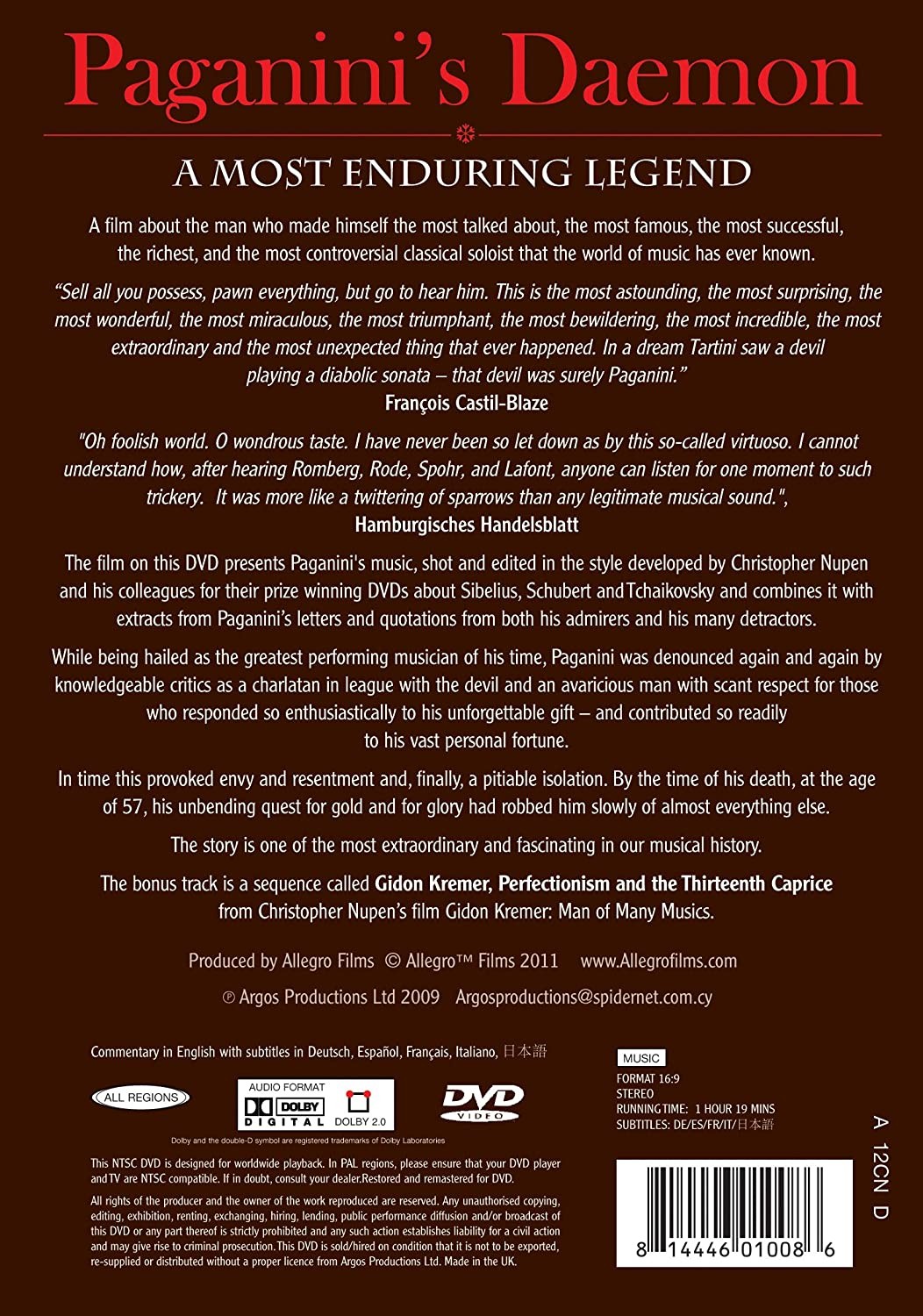 Cantidad de Discos: 1 | Lanzamiento: 2011 | Género(s): Classical | Audio: Inglés (Dolby Digital 2,0 Stereo) | SubtÃtulos: Alemán, Español, Francés, Italiano, Japonés | TÃtulo: Paganini’s Daemon: Most Enduring Legend | Director(es): Michael Mann | Norma / Región: Multizona | Cantidad de Discos: 1 | Lanzamiento: 2011 | Género(s): Classical | Audio: Inglés (Dolby Digital 2,0 Stereo) | SubtÃtulos: Alemán, Español, Francés, Italiano, Japonés | TÃtulo: Paganini’s Daemon: Most Enduring Legend | Director(es): Michael Mann | Norma / Región: Multizona