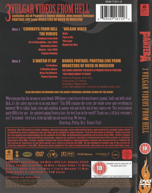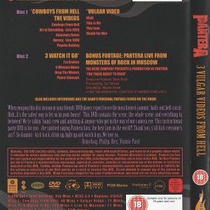 Artista(s) / Grupo: Pantera | Cantidad de Discos: 2 | Lanzamiento: 2006 | Género(s): Rock | Estilo(s): Heavy Metal, Thrash | TÃtulo: 3 Vulgar Videos From Hell | Norma / Región: NTSC (Región 2, 3, 4, 5) | Artista(s) / Grupo: Pantera | Cantidad de Discos: 2 | Lanzamiento: 2006 | Género(s): Rock | Estilo(s): Heavy Metal, Thrash | TÃtulo: 3 Vulgar Videos From Hell | Norma / Región: NTSC (Región 2, 3, 4, 5)