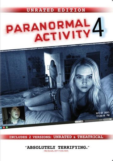 Cantidad de Discos: 1 | Lanzamiento: 2012 | Género(s): Terror | Audio: Español, Inglés, Francés | Subtítulos: Inglés, Español, Francés, Portugués | Título: Actividad paranormal 4 | Director(es): Henry Joost, Ariel Schulman | Reparto: Kathryn Newton, Matt Shively, Katie Featherston, Brady Allen, Aiden Lovekamp, Sprague Grayden, Stephen Dunham | Norma / Región: NTSC 1