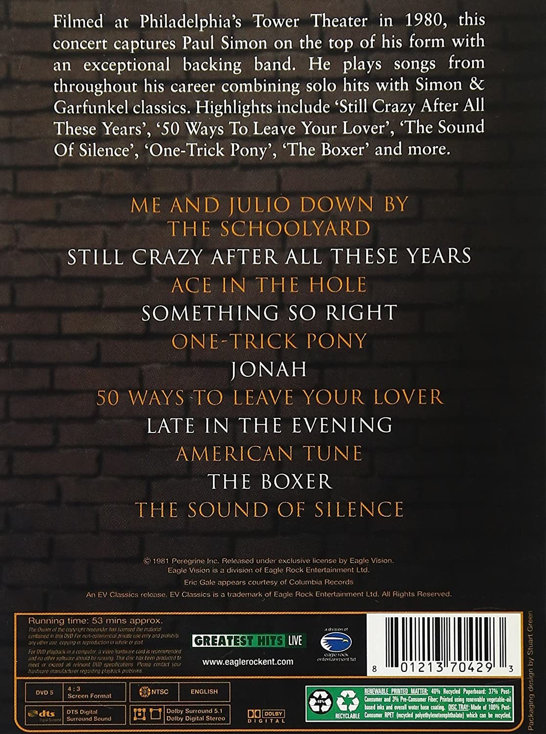 Artista(s) / Grupo: Paul Simon | Cantidad de Discos: 1 | Lanzamiento: 2008 | Género(s): Rock, Pop. | Estilo(s): Rock, Pop. | Título: Live From Philadelphia | Norma / Región: NTSC (Región A) | Artista(s) / Grupo: Paul Simon | Cantidad de Discos: 1 | Lanzamiento: 2008 | Género(s): Rock, Pop. | Estilo(s): Rock, Pop. | Título: Live From Philadelphia | Norma / Región: NTSC (Región A)