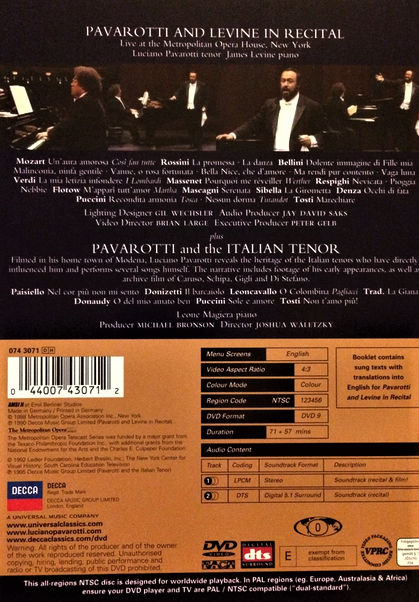 Artista(s) / Grupo: Luciano Pavarotti, James Levine | Lanzamiento: 2004 | Género(s): Classical, Ópera | Audio: Inglés (Dolby Digital 5.1), Inglés (DTS 5.1) | TÃtulo: Pavarotti and Levine in Recital | Director(es): Brian Large | Reparto: Enrico Caruso, Beniamo Gigli, Tito Schipa, The Metropolitan Opera | Norma / Región: NTSC (Región 1, 4) | Artista(s) / Grupo: Luciano Pavarotti, James Levine | Lanzamiento: 2004 | Género(s): Classical, Ópera | Audio: Inglés (Dolby Digital 5.1), Inglés (DTS 5.1) | TÃtulo: Pavarotti and Levine in Recital | Director(es): Brian Large | Reparto: Enrico Caruso, Beniamo Gigli, Tito Schipa, The Metropolitan Opera | Norma / Región: NTSC (Región 1, 4)