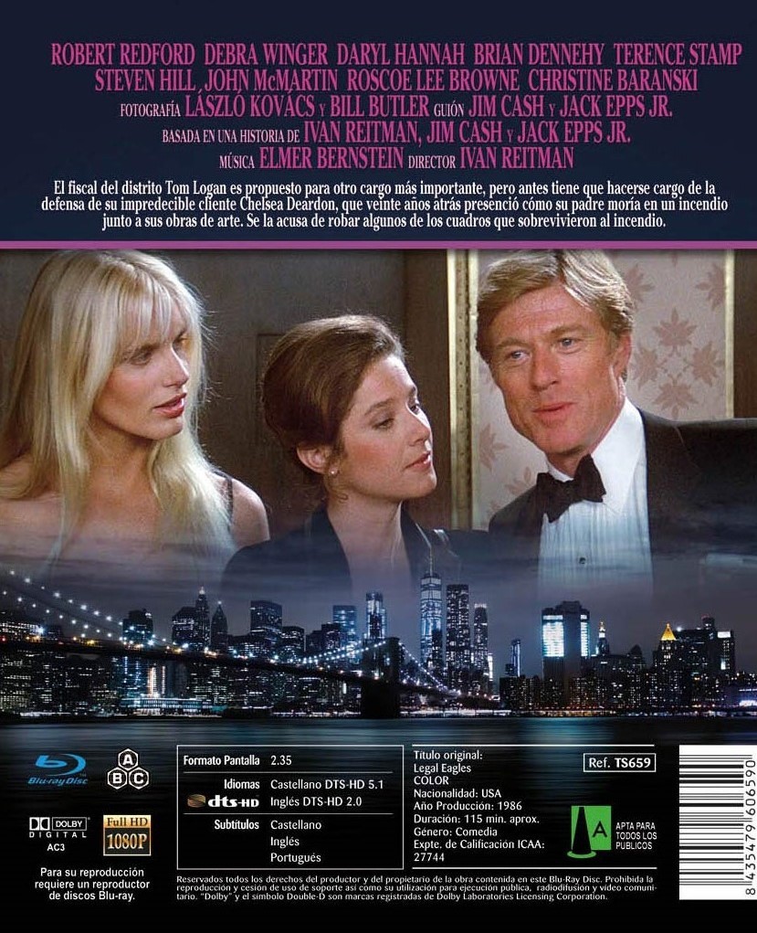 Cantidad de Discos: 1 BLR | Lanzamiento: 1986 | Género(s): Comedia, Romance, Drama, Intriga | Audio: Español (Dolby Digital 5.1), Inglés (Dolby Digital 2.0) | SubtÃtulos: Español, Inglés, Portugués | TÃtulo: Legal Eagles | Director(es): Ivan Reitman | Reparto: Robert Redford, Debra Winger, Daryl Hannah, Brian Dennehy, Terence Stamp, Steven Hill, John McMartin, Roscoe Lee Browne, Christine Baranski