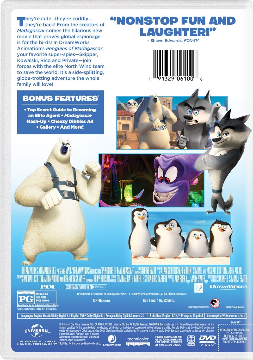 Cantidad de Discos: 1 | Lanzamiento: 2014 | Género(s): Animación | Audio: Inglés, Francés, Español | SubtÃtulos: Español, Inglés, Francés | TÃtulo: Penguins of Madagascar | Director(es): Simon J. Smith | Sub-CategorÃas: Infantil | Norma / Región: NTSC 1 | Cantidad de Discos: 1 | Lanzamiento: 2014 | Género(s): Animación | Audio: Inglés, Francés, Español | SubtÃtulos: Español, Inglés, Francés | TÃtulo: Penguins of Madagascar | Director(es): Simon J. Smith | Sub-CategorÃas: Infantil | Norma / Región: NTSC 1