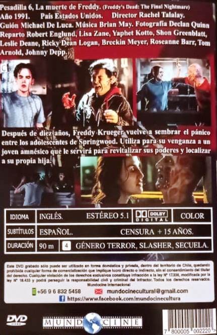 Cantidad de Discos: 1 | Lanzamiento: 1991 | Género(s): Terror | Audio: Inglés (DTS-HD MA 5.1) | SubtÃtulos: Español | TÃtulo: Freddy’s Dead: The Final Nightmare o A Nightmare on Elm Street 6 | Director(es): Rachel Talalay | Reparto: Robert Englund, Lisa Zane, Yaphet Kotto, Shon Greenblatt, Leslie Deane, Ricky Dean Logan, Breckin Meyer, Roseanne, Tom Arnold, Johnny Depp | Norma / Región: Multizona (Disco Quemado) | Cantidad de Discos: 1 | Lanzamiento: 1991 | Género(s): Terror | Audio: Inglés (DTS-HD MA 5.1) | SubtÃtulos: Español | TÃtulo: Freddy’s Dead: The Final Nightmare o A Nightmare on Elm Street 6 | Director(es): Rachel Talalay | Reparto: Robert Englund, Lisa Zane, Yaphet Kotto, Shon Greenblatt, Leslie Deane, Ricky Dean Logan, Breckin Meyer, Roseanne, Tom Arnold, Johnny Depp | Norma / Región: Multizona (Disco Quemado)
