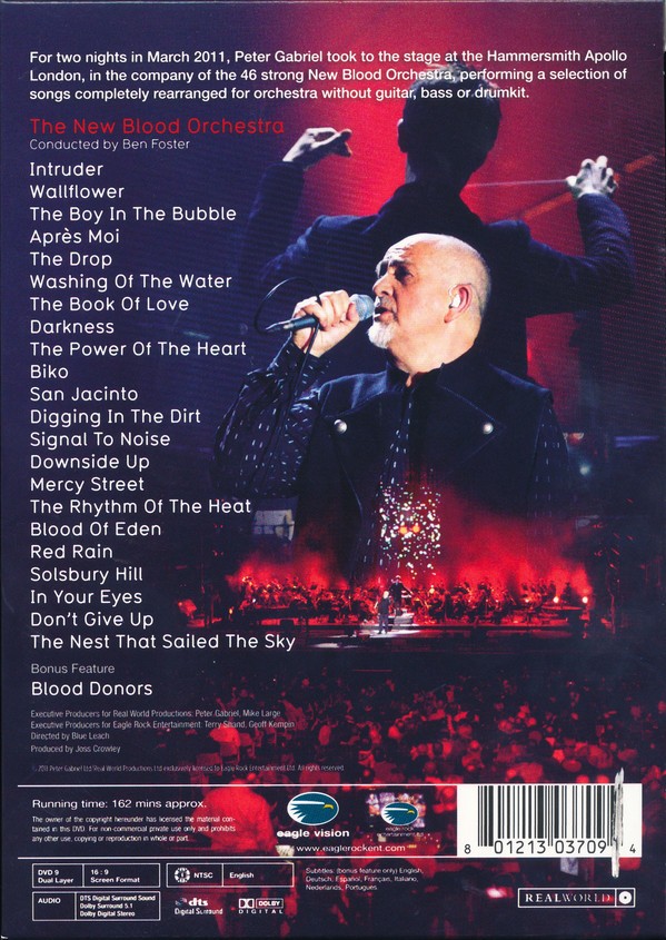Artista(s) / Grupo: Peter Gabriel | Cantidad de Discos: 1 | Lanzamiento: 2011 | Género(s): Rock, Classical. | Estilo(s): Art Rock, Symphonic Rock, Prog Rock. | TÃtulo: New Blood – Live In London | Norma / Región: NTSC (Región A) | Artista(s) / Grupo: Peter Gabriel | Cantidad de Discos: 1 | Lanzamiento: 2011 | Género(s): Rock, Classical. | Estilo(s): Art Rock, Symphonic Rock, Prog Rock. | TÃtulo: New Blood – Live In London | Norma / Región: NTSC (Región A)