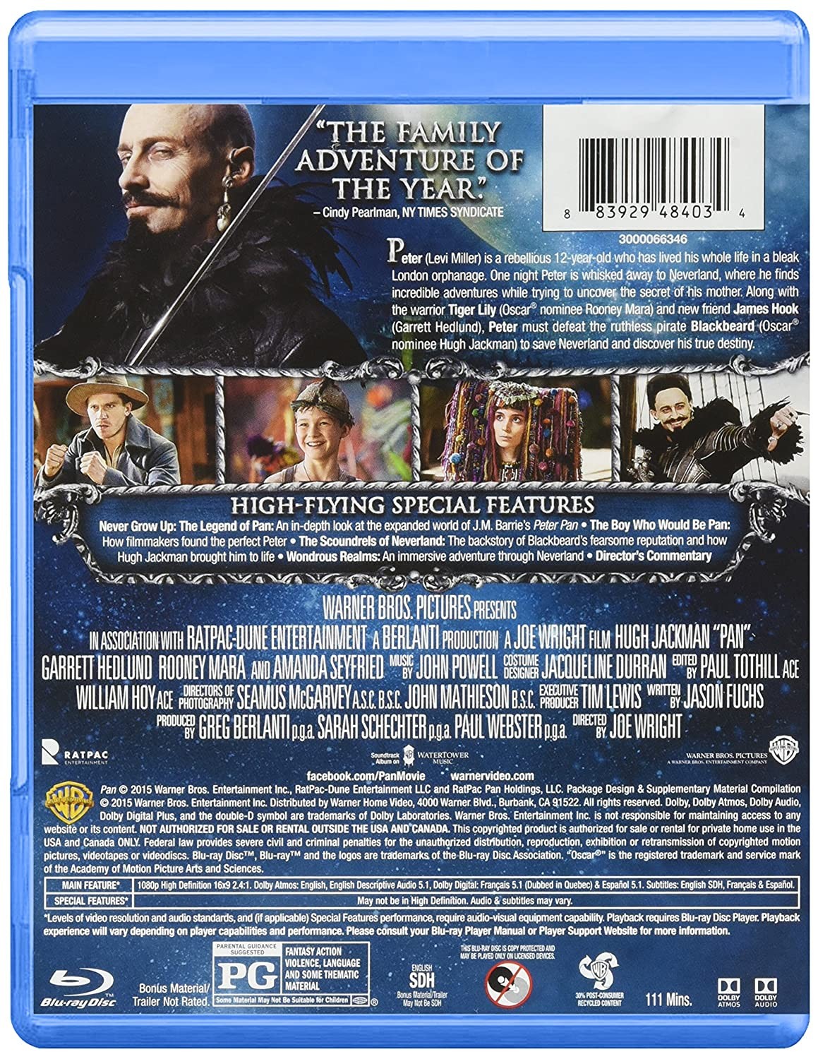 Cantidad de Discos: 1 BluRay + 1 DVD | Lanzamiento: 2015 | Género(s): Acción, Aventura, FantasÃa | Audio: Español (Dolby Digital 5,1), Inglés (Dolby Digital 5,1) | SubtÃtulos: Español, Inglés, Francés | TÃtulo: Pan | Director(es): Joe Wright | Reparto: Levi Miller, Garrett Hedlund, Hugh Jackman, Rooney Mara, Amanda Seyfried, Adeel Akhtar, Nonso Anozie, Cara Delevingne, Kathy Burke, Lewis MacDougall, Jack Lowden, Jimmy Vee, Phill Martin, Ami Metcalf, Jack Charles, Louis Partridge | Norma / Región: NTSC (Región A) | Cantidad de Discos: 1 BluRay + 1 DVD | Lanzamiento: 2015 | Género(s): Acción, Aventura, FantasÃa | Audio: Español (Dolby Digital 5,1), Inglés (Dolby Digital 5,1) | SubtÃtulos: Español, Inglés, Francés | TÃtulo: Pan | Director(es): Joe Wright | Reparto: Levi Miller, Garrett Hedlund, Hugh Jackman, Rooney Mara, Amanda Seyfried, Adeel Akhtar, Nonso Anozie, Cara Delevingne, Kathy Burke, Lewis MacDougall, Jack Lowden, Jimmy Vee, Phill Martin, Ami Metcalf, Jack Charles, Louis Partridg