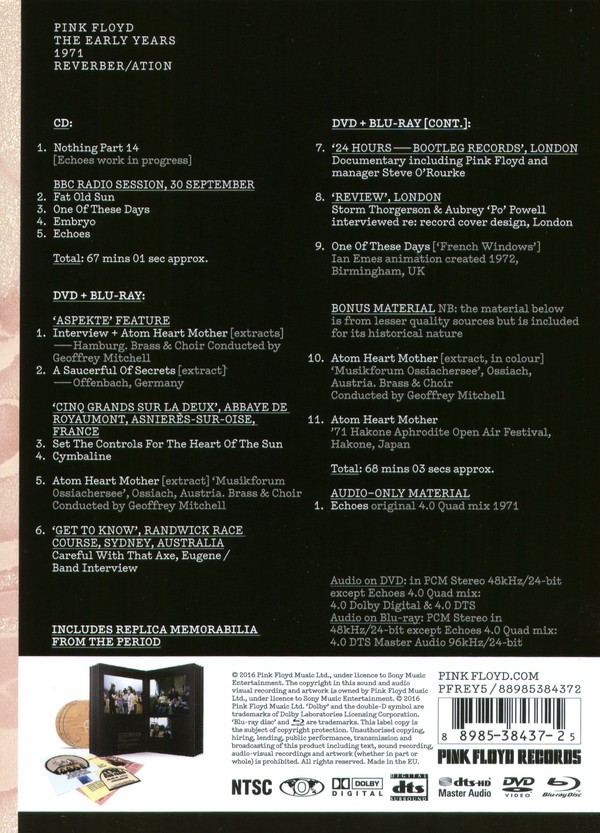 Artista(s) / Grupo: Pink Floyd | Cantidad de Discos: 1 BluRay + 1 DVD + 2 CD + Libro | Lanzamiento: 2017 | Género(s): Rock | Estilo(s): Psychedelic Rock, Prog Rock | TÃtulo: The Early Years 1971 Reverber/ation | Norma / Región: NTSC (Región A) | Artista(s) / Grupo: Pink Floyd | Cantidad de Discos: 1 BluRay + 1 DVD + 2 CD + Libro | Lanzamiento: 2017 | Género(s): Rock | Estilo(s): Psychedelic Rock, Prog Rock | TÃtulo: The Early Years 1971 Reverber/ation | Norma / Región: NTSC (Región A)